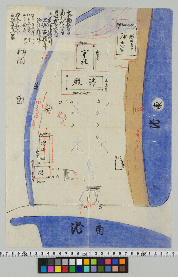 松原市別所6丁目に所在する熱田神社の境内を描いた絵図である。絵図名の記載はない。建物の他に手水鉢など石造物も記載おり、池溝が青、堤体が黄色で表現されている。