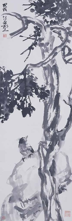 孤禽柏樹図(白頭翁と柏)