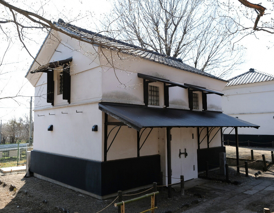 前橋市朝日町から移築した旧家財蔵。敷地南東に北面して建つ2階建切妻造平入桟瓦葺。外壁白漆喰塗仕上で水切二段、腰は黒漆喰塗仕上。内部1階は腰に中敷居を入れ、小屋は地棟に束が立ち並ぶなど特徴的。戸口に掛子塗扉を吊り窓に鉄格子を嵌めた厳重な土蔵。