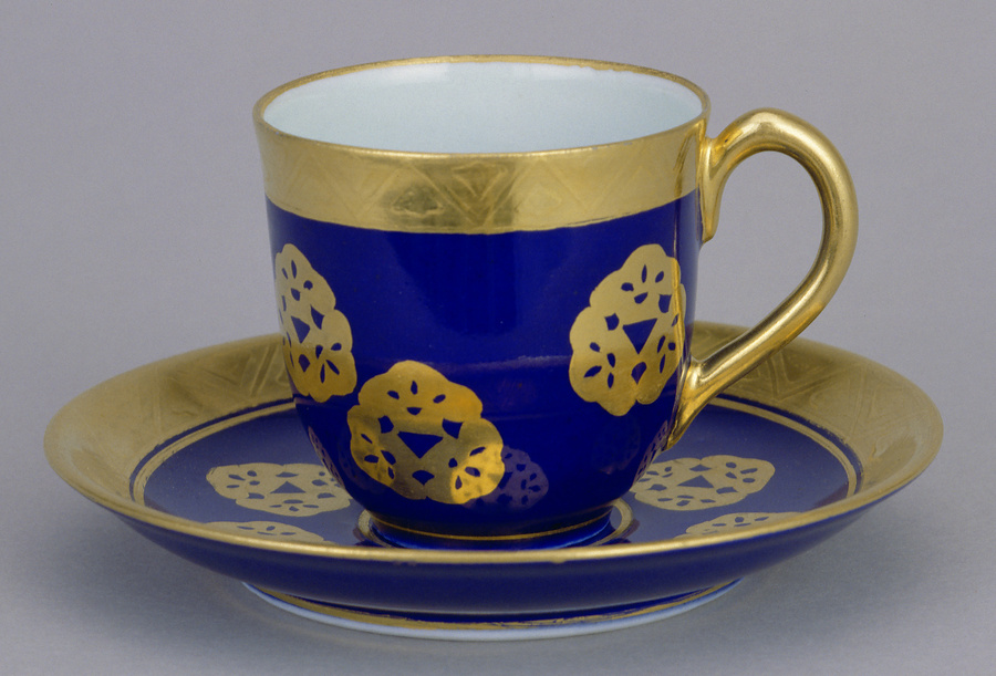 鴻池家伝来永楽関係資料 瑠璃地金彩三ツ松紋散コーヒー碗・受皿