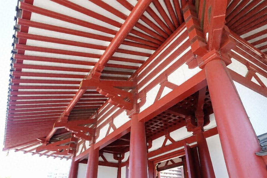 詳細な発掘調査に基づき、創建位置に鉄骨鉄筋コンクリート造で復元した中門。三間一戸八脚門、入母屋造錣葺。一軒隅扇垂木、雲斗など全体に意匠は飛鳥様式とする。上部構造は塔や南大門との関係から単層とした。発掘成果に基づき古代寺院の姿を復元した初例。