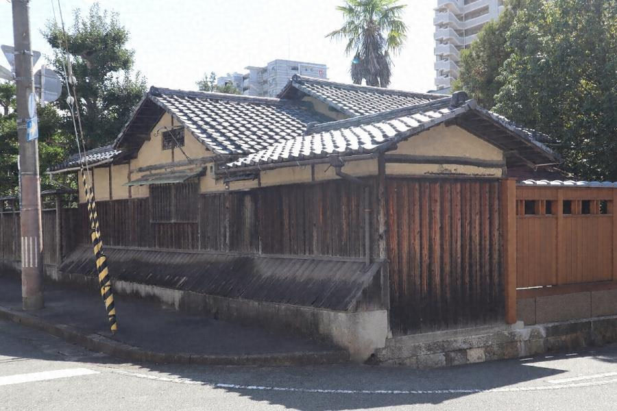 茶室の西に建つ独立の水屋。平屋建切妻造桟瓦葺の押入付六畳に、北側を落棟の土間、その東西に雪隠、物置をそれぞれ突出させる。磨き丸太の棟木や桁を用いる上質な造りで、真壁造中塗仕上で腰は屋敷側を杉皮張、街路側を竪板張として歴史的景観を形成する。
