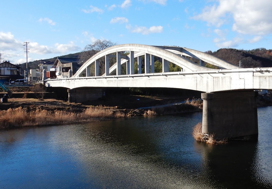 千曲川上流に架かる道路橋。左右にゲルバー桁を配した、放物線アーチを描く支間四五メートルの鉄筋コンクリート造ローゼ橋で、端部には尖塔アーチをモチーフにした大型の親柱を配する。ローゼ橋技術を確立した中島武が手がけたローゼ橋の中で最大支間を誇る。