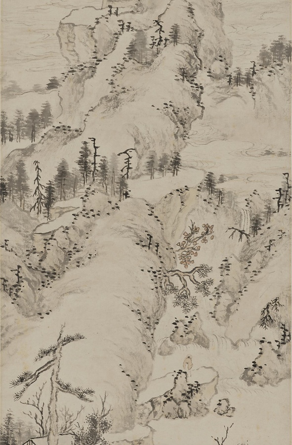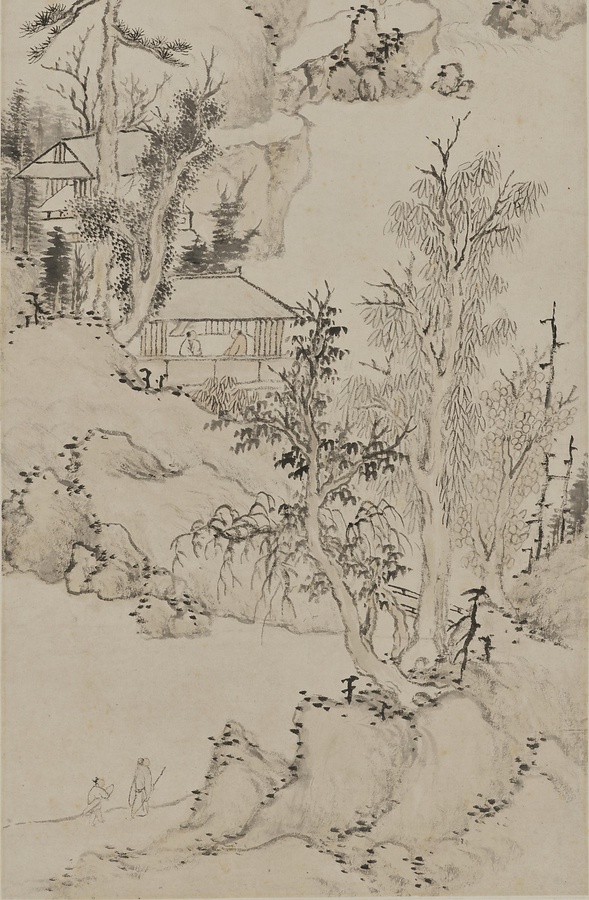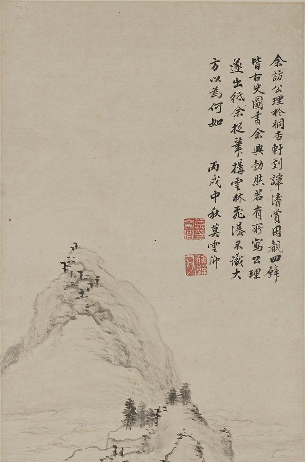 莫是龍は華亭@かてい@(上海市)出身の書家、画家、評論家。本作は公理@こうり@と呼ばれる人物の桐杏軒@とうきょうけん@を訪れ、興が乗って描いたという作品。やわらかい筆墨、繊細な淡彩、愛らしい画中人物に、文徴明画風の影響が見られます。
