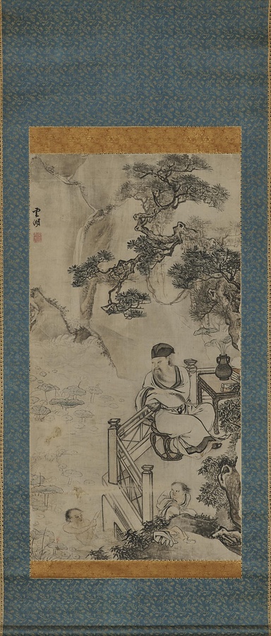 陶成は宝応@ほうおう@(江蘇省揚州)出身の文人画家。南宋@なんそう@風の人物を描いたといいます。蓮池の側で夏の暑さをしのぐ文人を描く本作は、「愛蓮説@あいれんせつ@」の作者として有名な周敦頤@しゅうとんい@(字は茂叔)を主題にしたものと伝わります。蓮と子どもの組み合わせは、「蓮」と「連」の同音から「連生貴子@れんせいきし@(続けて子どもを授かること)」の吉祥図像とも解釈できます。