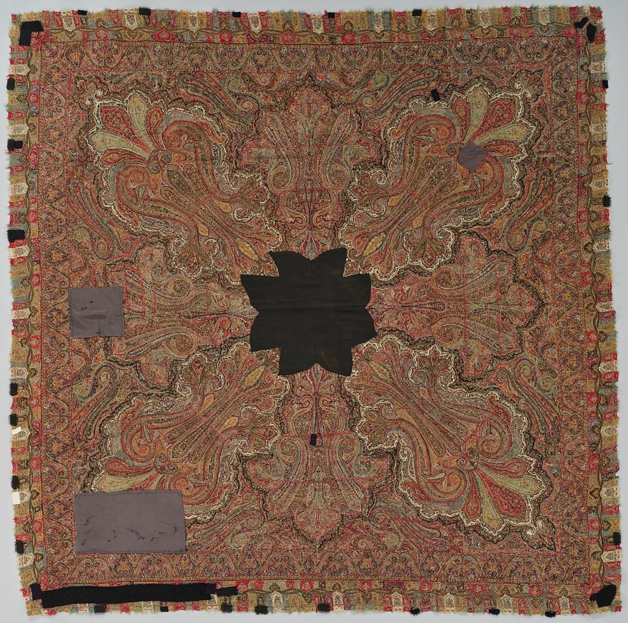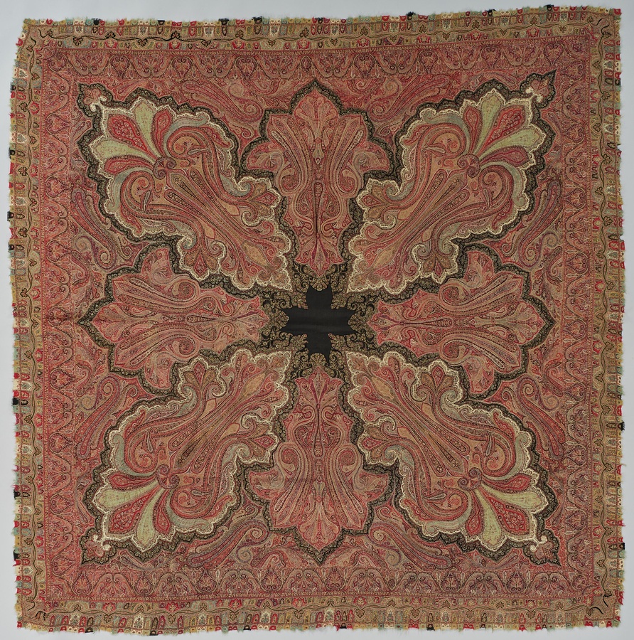 カシミヤ山羊の毛を細く紡ぎ、綴織としたショールです。よくみるとペイズリー文ひとつ分など、細分化して織りあげ、縫い合わせていることがわかります。およそ正方形であることから、19世紀中頃のヨーロッパのファッションを反映して、製作されたと考えられます。