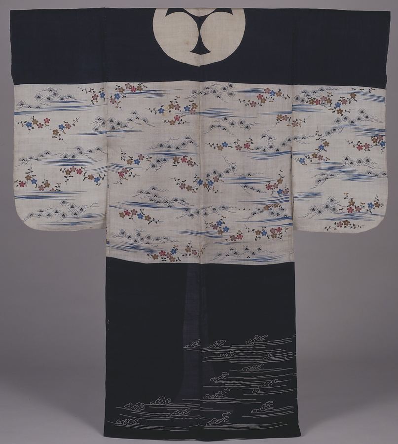 御所被衣(ごしょかずき)と呼ばれる公家の被衣は絹製の絽(ろ)であるが、町方の被衣の多くは平絹あるいは麻製で、首の付け根に大紋を置き、段替の構成をとる。段にはそれぞれ文様変わりの小紋を置くのが一般的であるが、この一領では腰の部分に両面から色挿しをした友禅染で松梅文様をおく点がたいへん珍しい。振袖で仕立てがうぶなところも貴重である。ほかに例をみない上質な施工で、上方の裕福な町方で着用された品であろう。