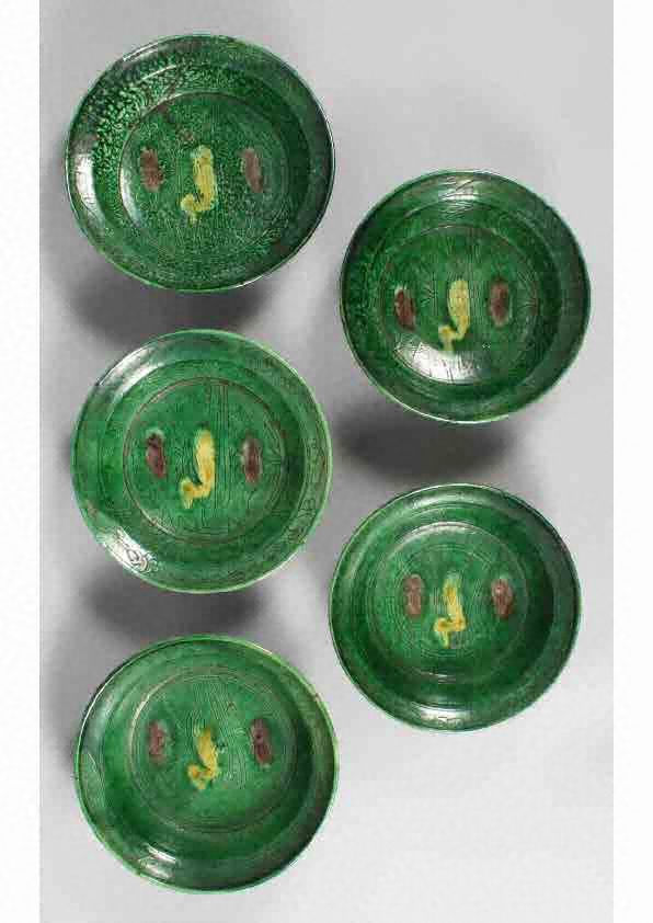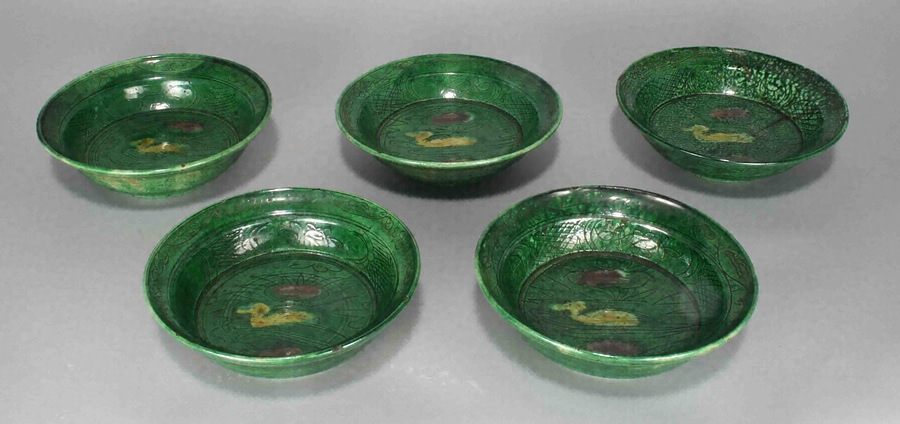華南三彩刻花花鳥文平鉢