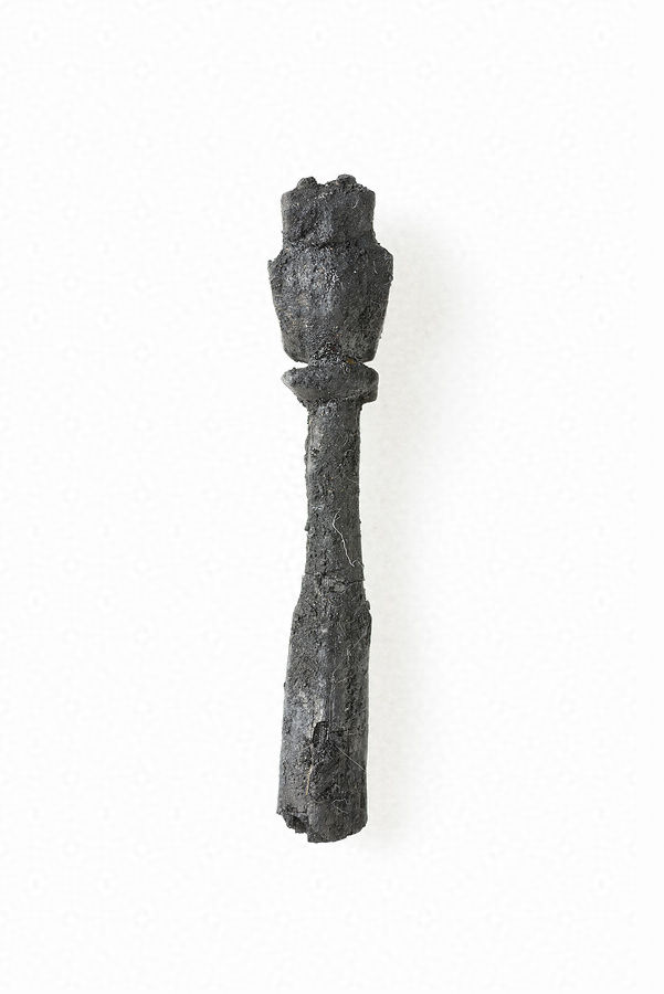 先端にフクロウ形の彫刻が付いた棒状の木製品。焼失住居内から炭化した状態で発見された。下端が折れており、用途ははっきりしない。フクロウ形彫刻はよく見ると羽角が表現されており、シマフクロウ、あるいはミミズクの仲間を表現したものであろうと考えられる。