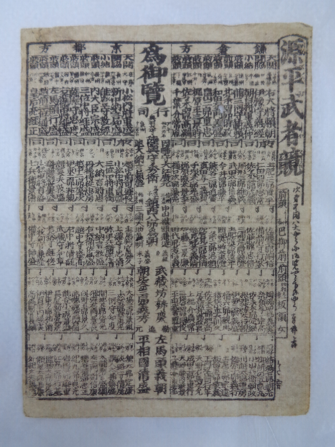 源氏を鎌倉方(大関・右大将頼朝)、平氏を京都方(小松内府重盛)とに分けて番付のように並べ、格付けした見立番付。鎌倉方には、伊予守(源)義経や朝日将軍(源)義仲、巴御前などの名が見られ、行司の一人に義経家臣・武蔵坊弁慶がいる。