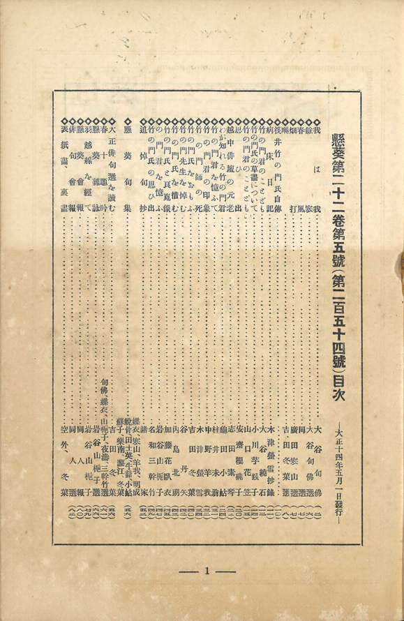 本号は、生前親交のあった人々が筏井竹の門を偲び、寄稿している。追悼句抄には句仏、高浜虚子、河東碧梧桐、冨田渓仙ら69人の名がある。