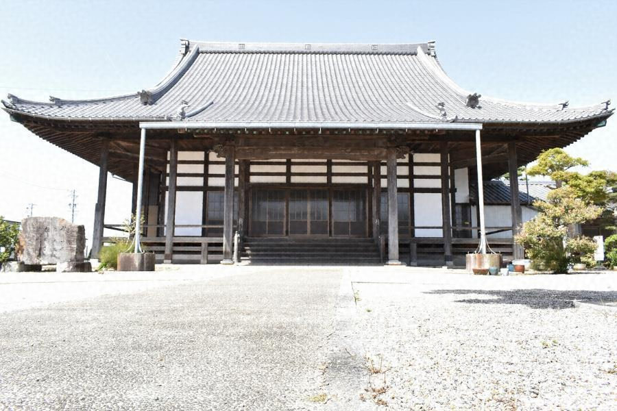 安城市東端に位置。桁行9間梁間7間、入母屋造桟瓦葺で向拝を付す。妻に鰭を波型とする懸魚を付す。内部は表側を外陣、中央を矢来内、奥を内陣及び余間とする真宗寺院本堂の典型。中規模だが用材を吟味し、特徴的な彫刻等、地域の岡田大工の遺構として重要。