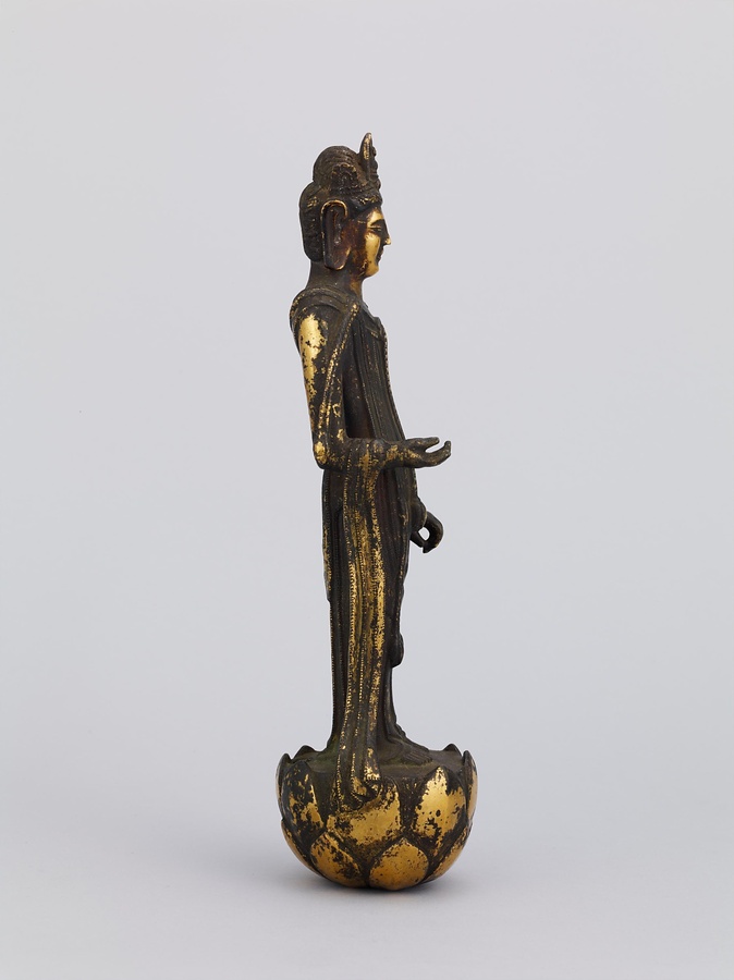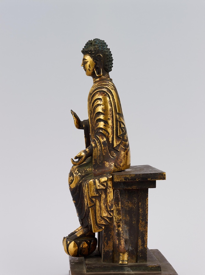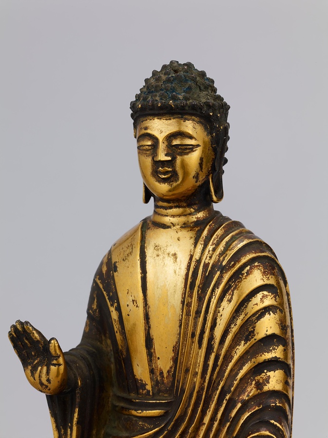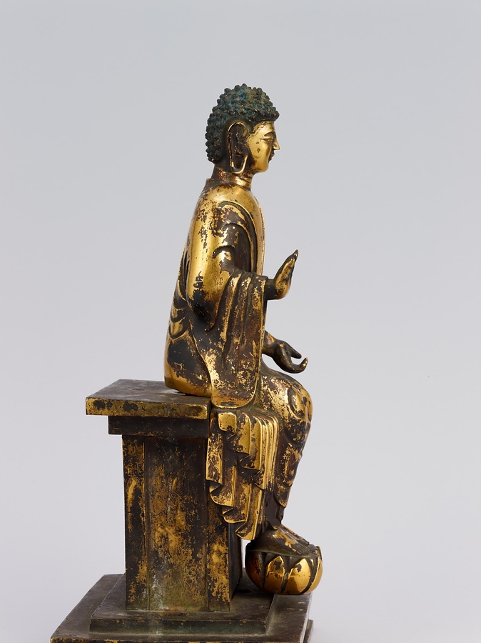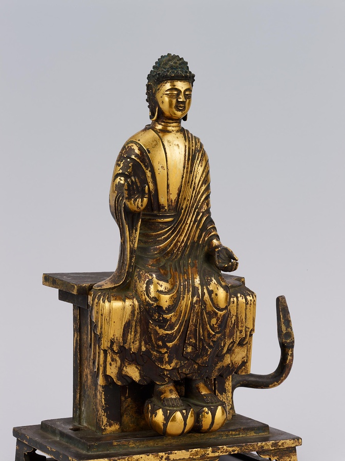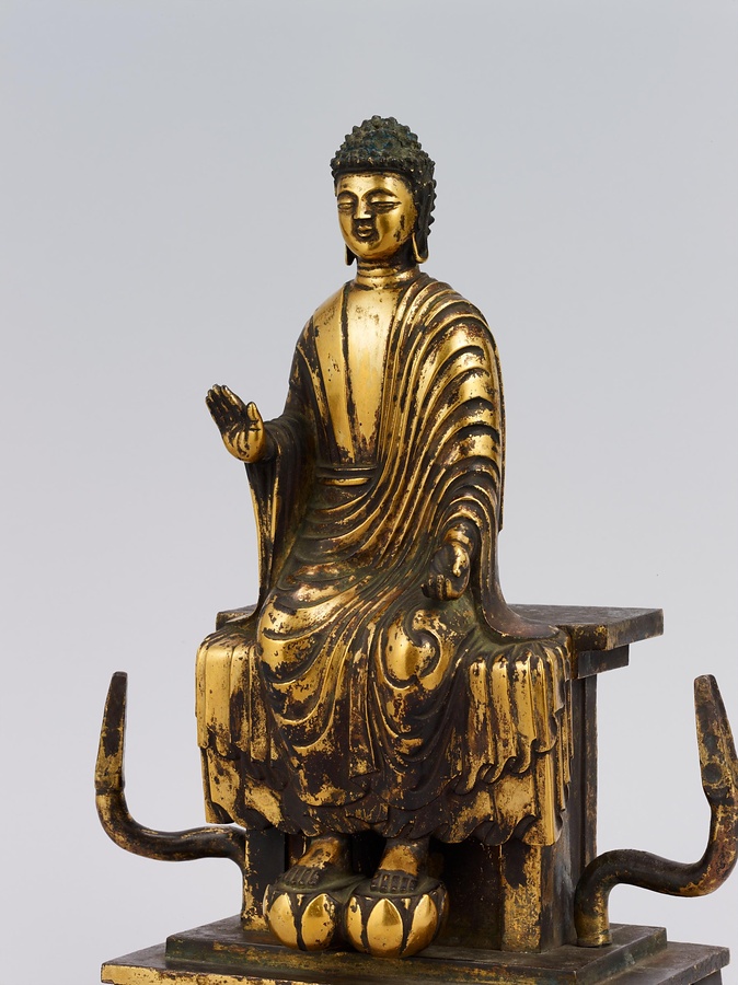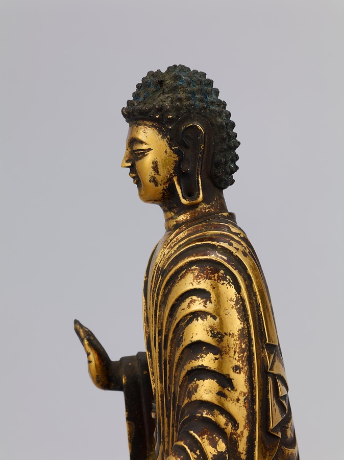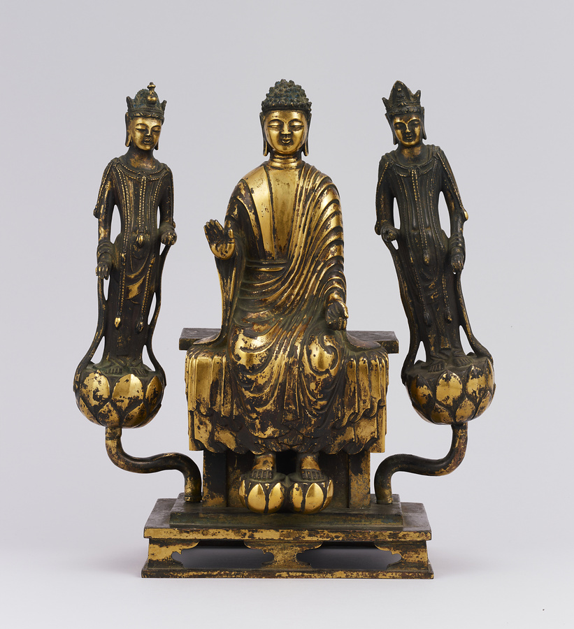 中央の仏は一般的な如来の姿であるものの、両脇に立つ菩薩の頭につけられたシンボルから、右方に観音菩薩、左方に勢至菩薩を伴う、日本最古の阿弥陀三尊像であることがわかります。仏が椅坐する点や、菩薩が浄土の蓮池から生える蓮華に立つ点は、古代に好まれた表現です。