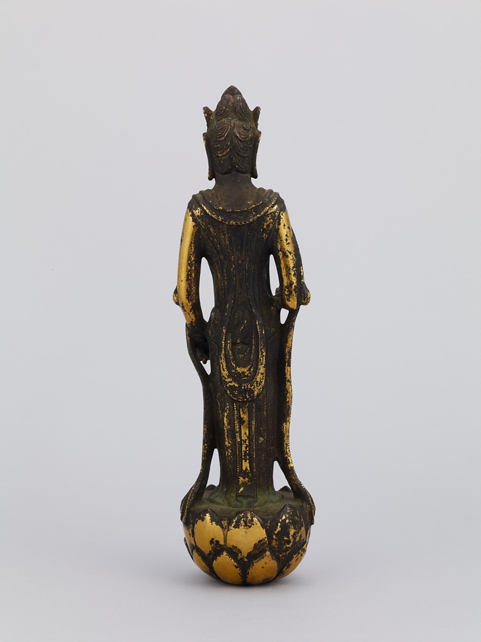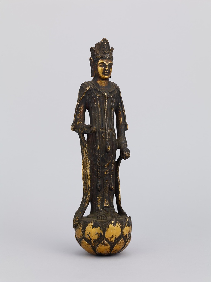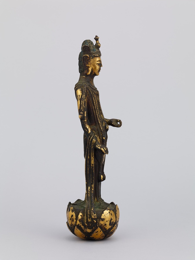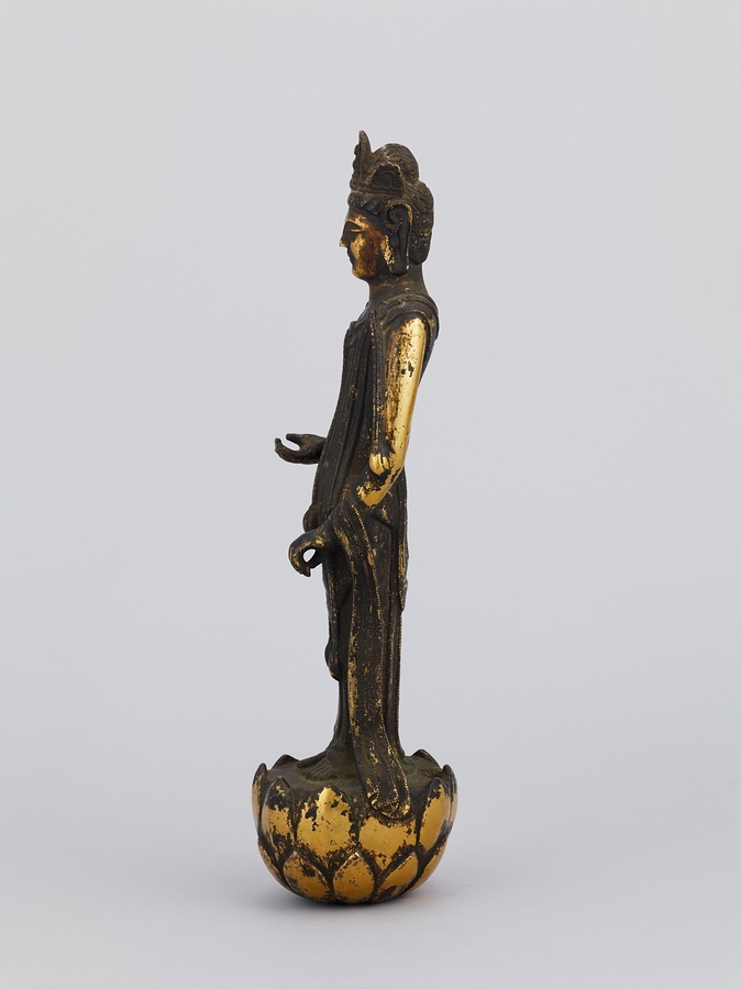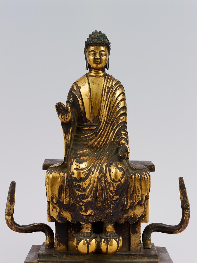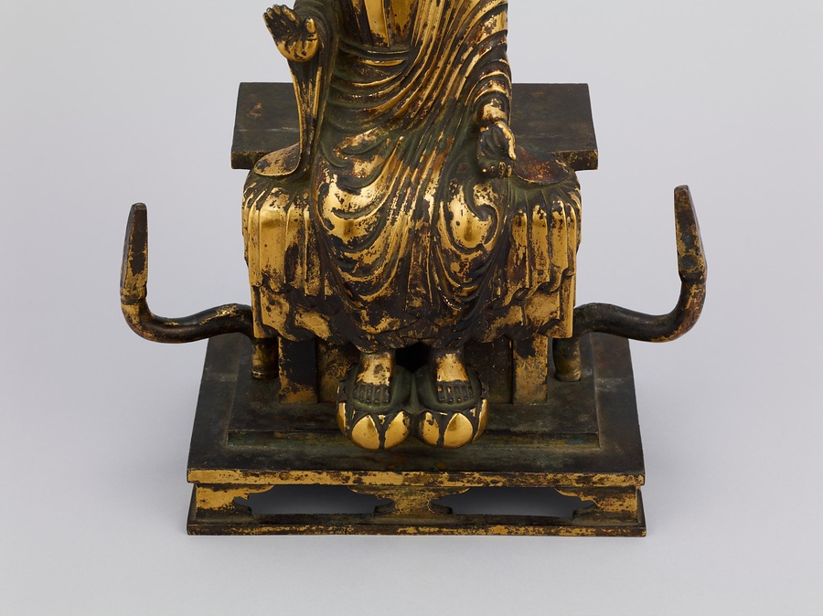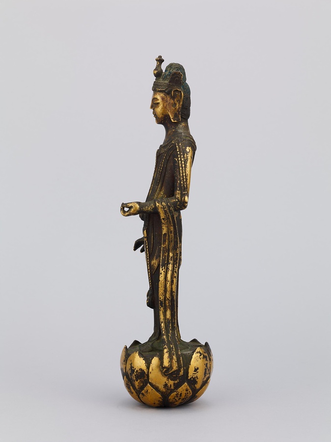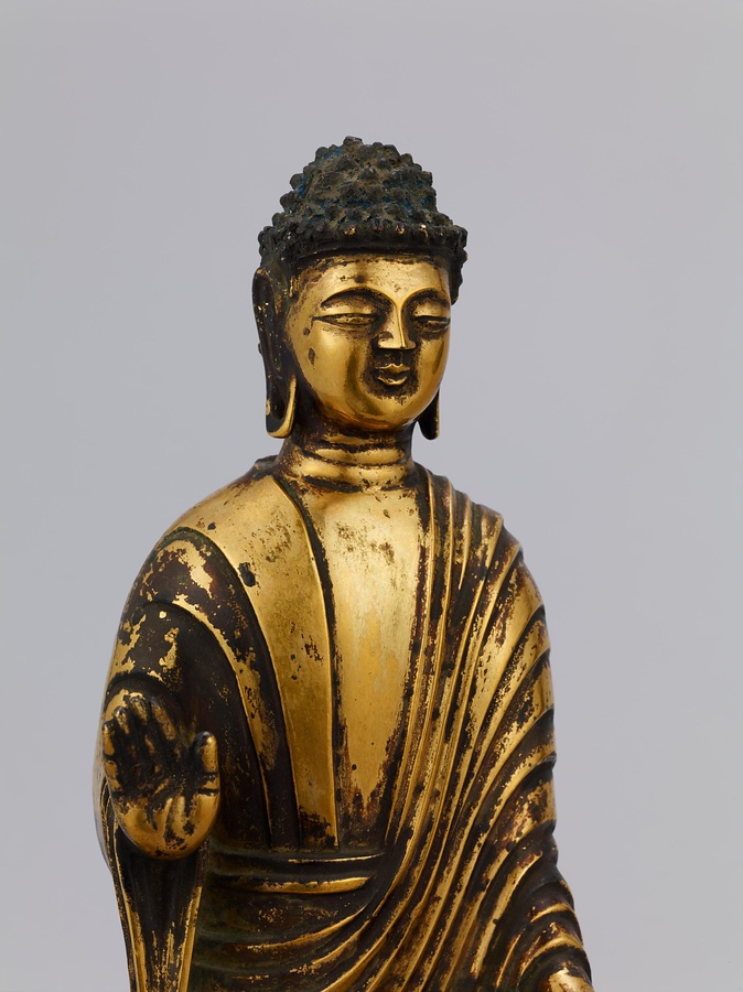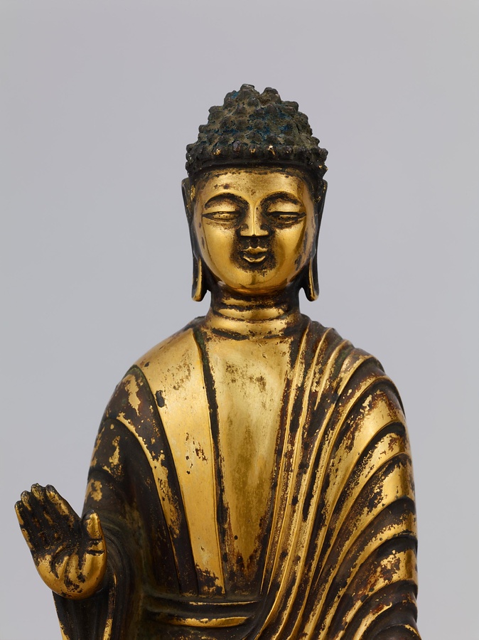 中央の仏は一般的な如来の姿であるものの、両脇に立つ菩薩の頭につけられたシンボルから、右方に観音菩薩、左方に勢至菩薩を伴う、日本最古の阿弥陀三尊像であることがわかります。仏が椅坐する点や、菩薩が浄土の蓮池から生える蓮華に立つ点は、古代に好まれた表現です。