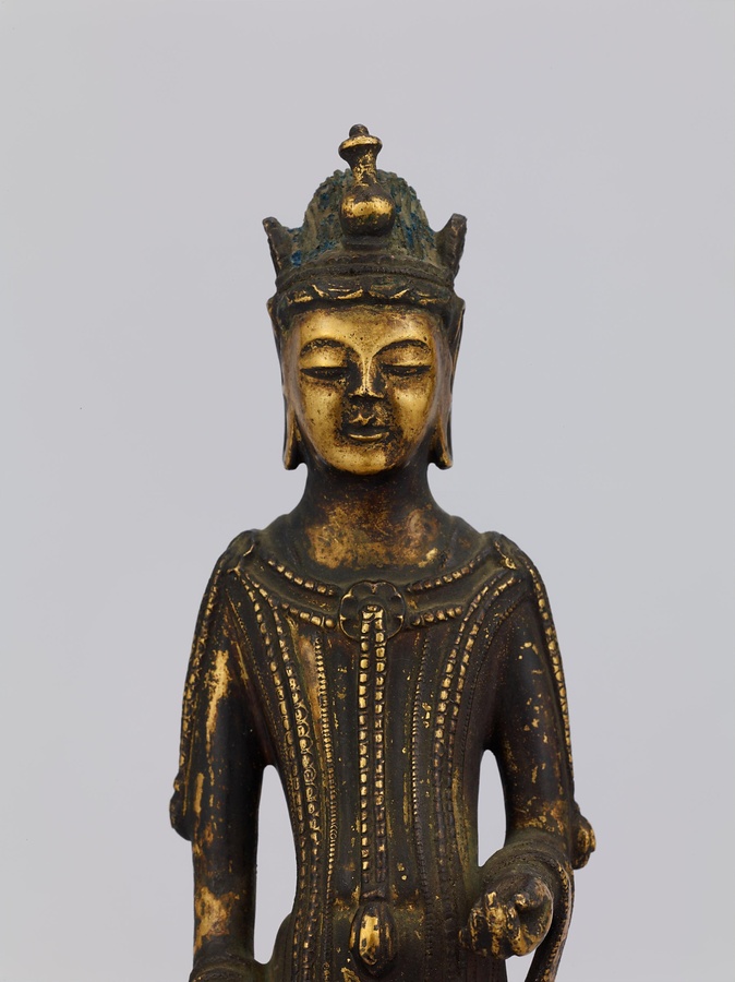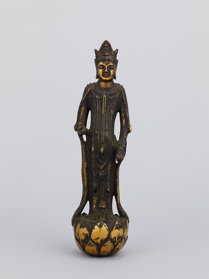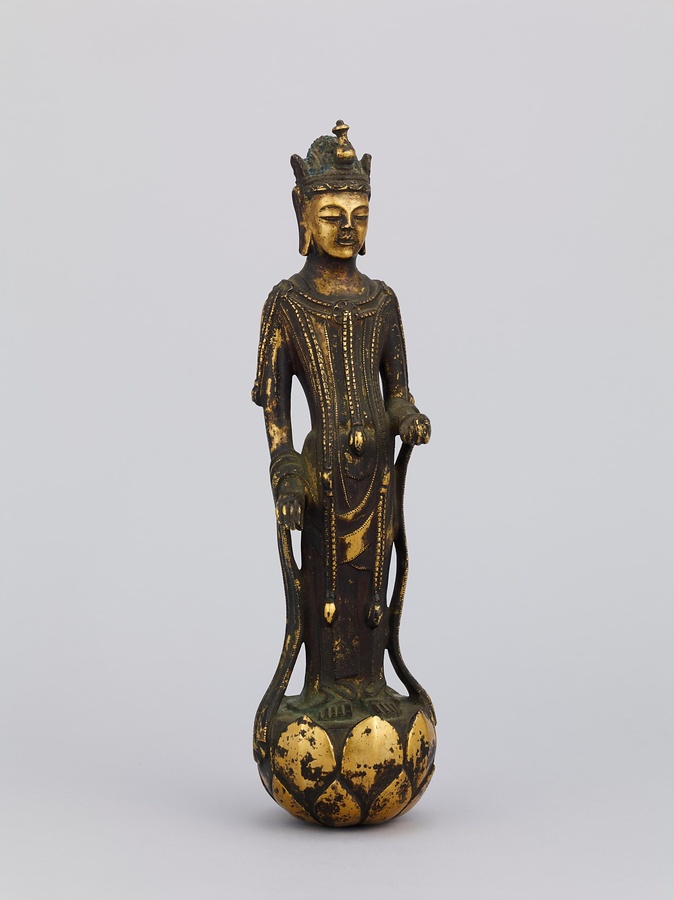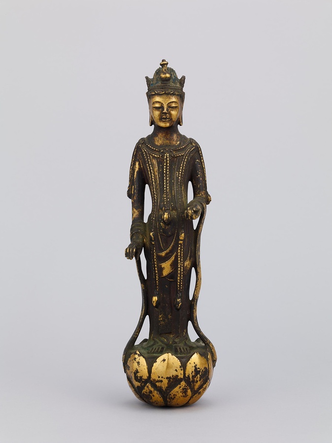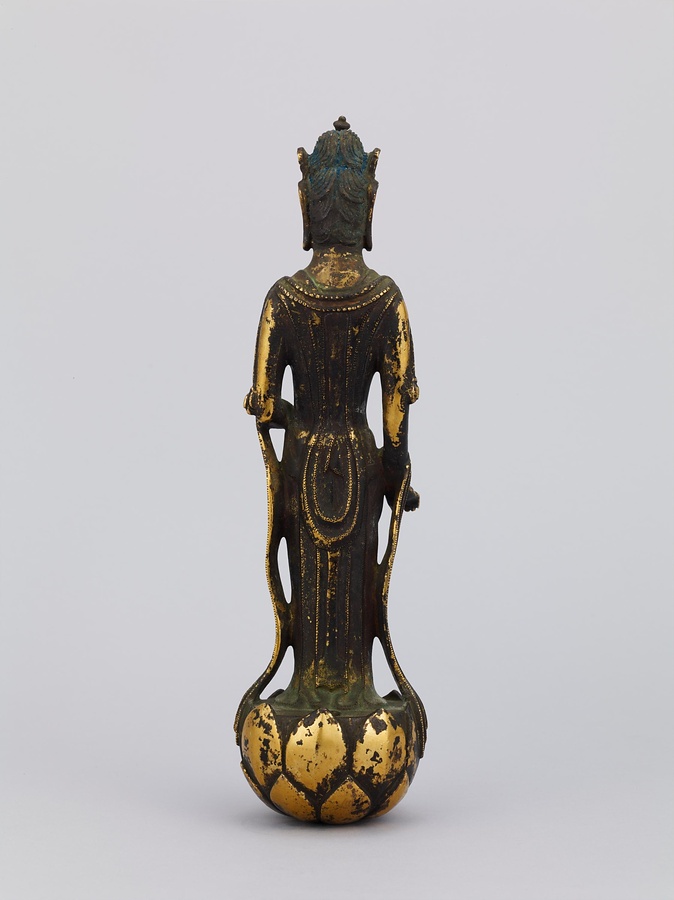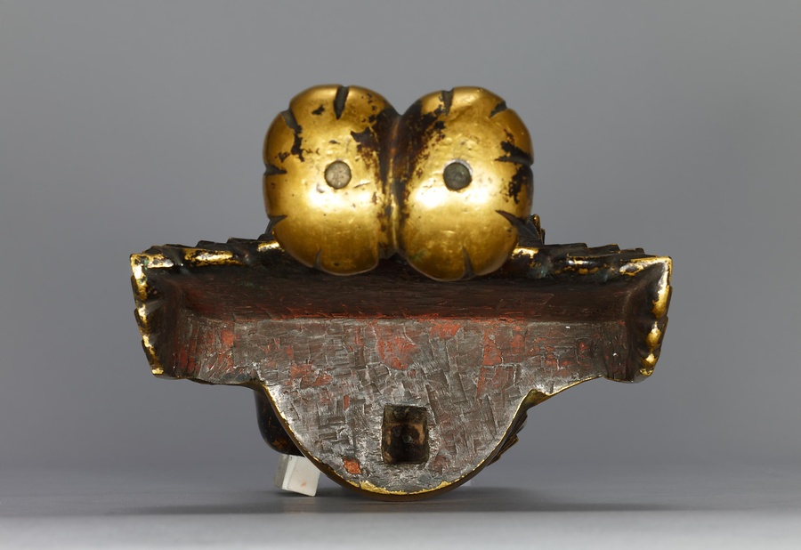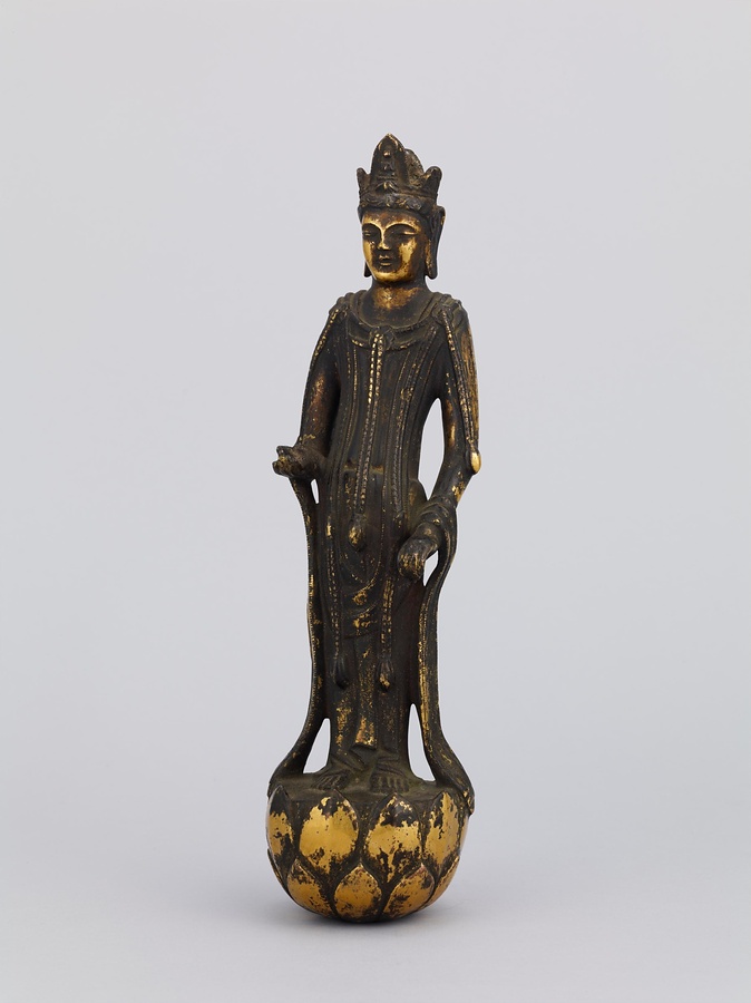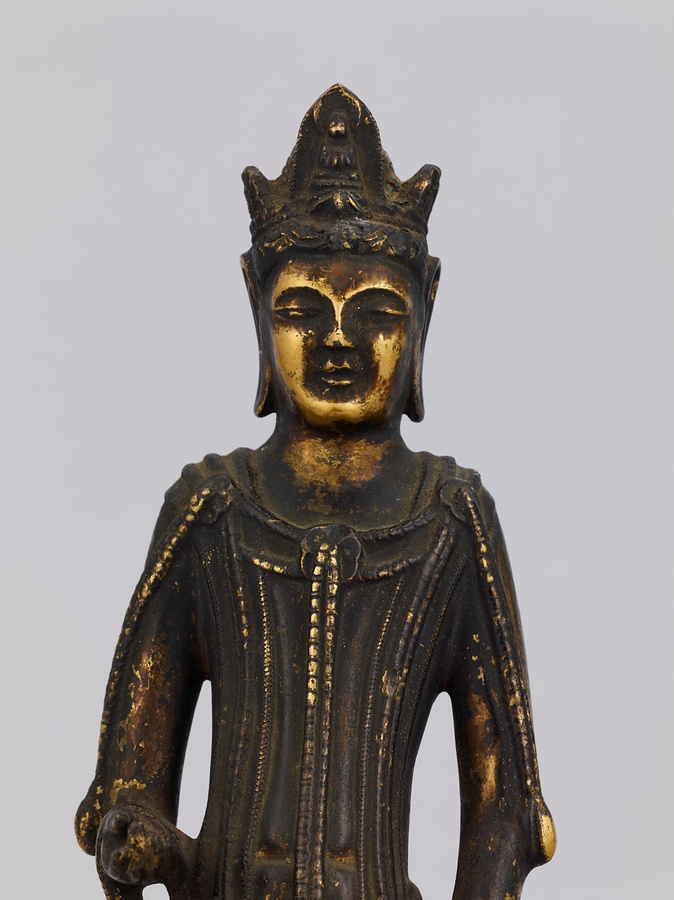 中央の仏は一般的な如来の姿であるものの、両脇に立つ菩薩の頭につけられたシンボルから、右方に観音菩薩、左方に勢至菩薩を伴う、日本最古の阿弥陀三尊像であることがわかります。仏が椅坐する点や、菩薩が浄土の蓮池から生える蓮華に立つ点は、古代に好まれた表現です。