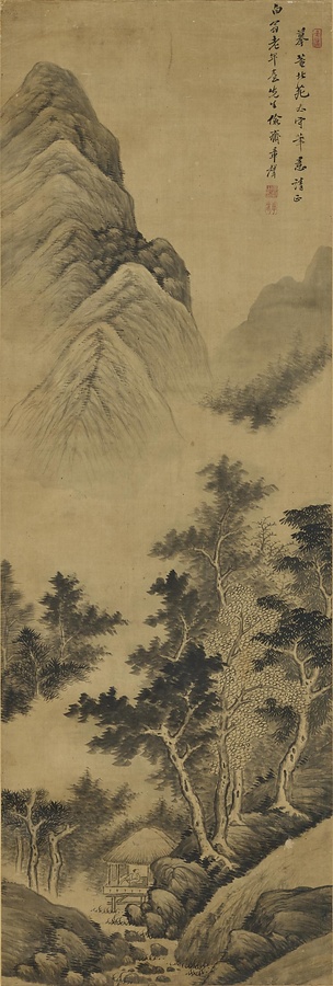 摸董源渓亭林影図軸