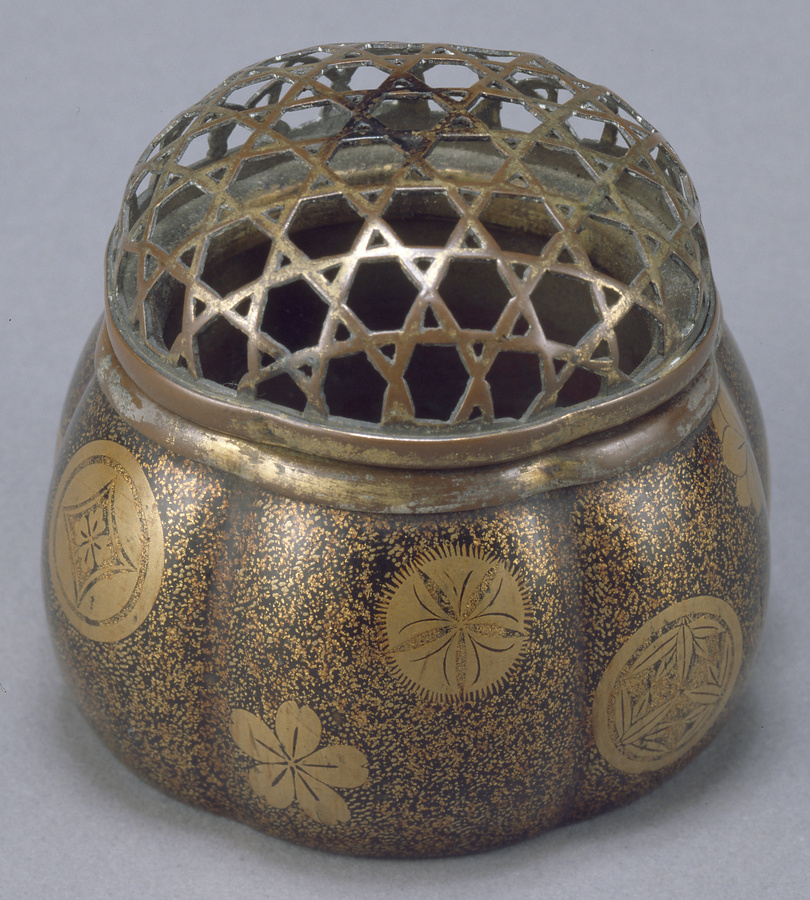 阿古陀瓜に形が似ているので、このように呼ばれている香炉。本作品は通常よりかなり小降りの手のひらサイズでかわいらしい。梨地に金平蒔絵と針描きの手法で、器全体に桜花、撫子、橘、菊、笹、七宝花皮菱などの紋が散らされている。これは実際の家紋ではなく、近世初頭に流行した文様の一種である。炉の内張りと籠目の透かし彫りのある火屋はいずれも金銅製。