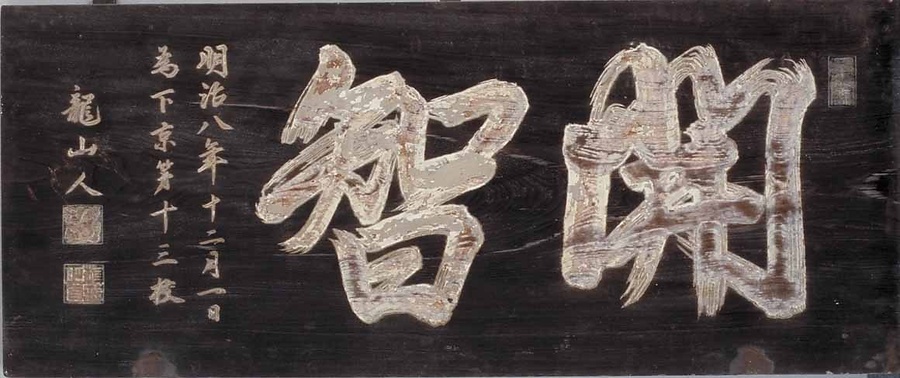 開校時の校名は△京第○○番組小学校、明治5(1872)年に△京区●●区小学校とかわり、明治7(1874)、8(1875)年頃には通称名として、地名や漢籍から引用した名前がつけられた。下京十一番組小学校は、下京区十三区小学校となり、明治8(1875)年12月に2代目京都府知事槙村正直が校舎改築を記念して「開智」と命名し、自ら校名を揮毫した。「開智」の語の出典はつまびらかでない。この木製扁額は、学区内の町が府知事の揮毫した校名をもとに作製し寄付したもので、閉校時まで校舎入口玄関に飾られていた。
