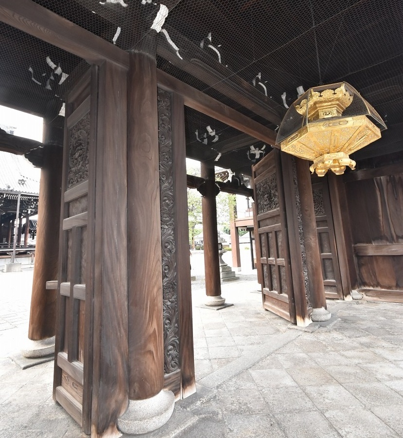御影堂の正面、堀川通りに東面して建つ入母屋造本瓦葺、三間三戸の楼門。柱は円柱で組物は三手先、隅は四手先、軒は二軒扇垂木。腰組を付し高欄付縁を廻らす。一階中央間の両脇羽目板を精緻な牡丹唐草彫刻で埋尽くし、本山寺院の正面を飾る軒反り雄大な三門。