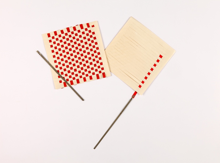 フレーベルによる二十恩物の一つ。四角い紙の内側を、縦に縞様に幾筋も切り線(縦線)を入れ、織針(はがね・真鍮・木製)を縦線に交互に織りこみ横線とし、精巧で美しい織り紙を作る。
