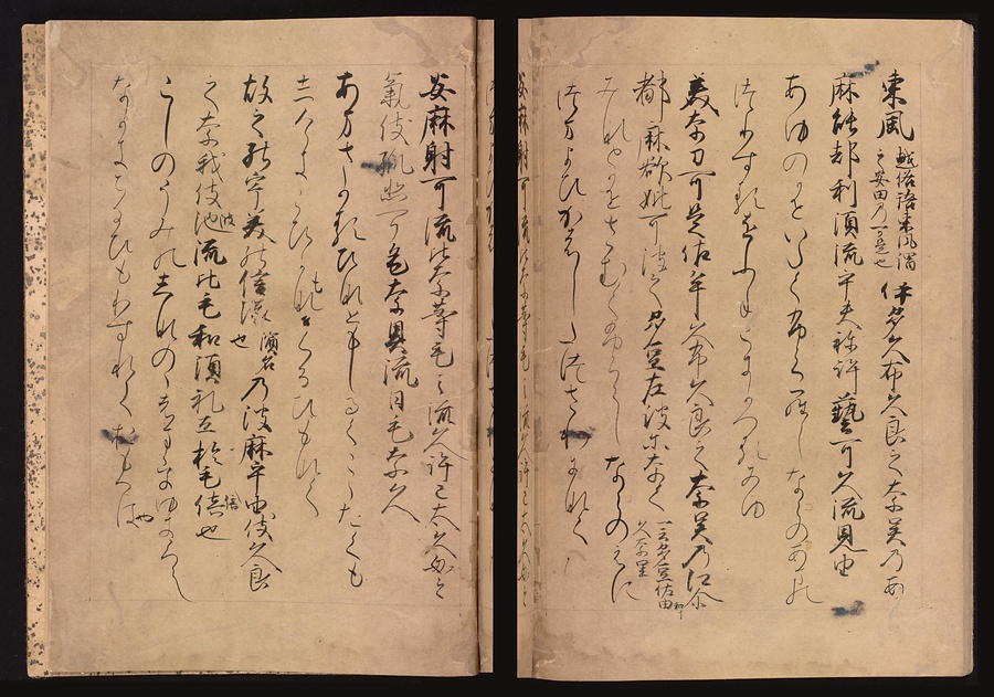 その書風は中国の影響から離れ、穏やかで伸びやかな和風の美しさをみせており、特に仮名にはここちよいリズムが感じられます。歌・紙・文字がそれぞれ響きあい、かたち作られた平安の美の世界をご堪能ください。