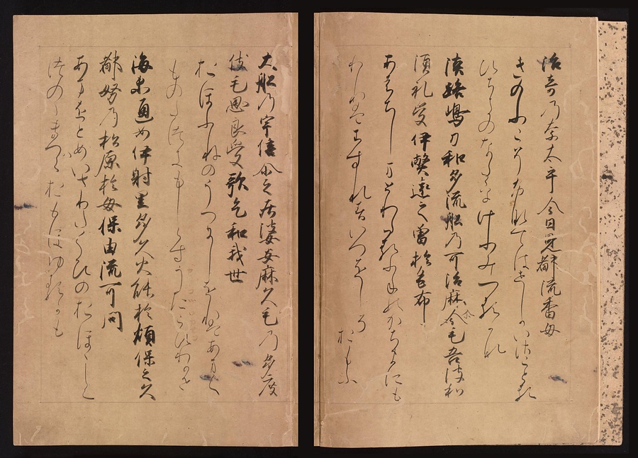 また紙自体も美しいもので、飛雲という紫と藍で染めた紙の繊維をすき込んだ鳥の子紙を用いています。
