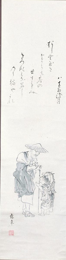 西村楠亭が描いた西行(さいぎょう)と子供の姿に、平安和歌四天王の一人である澄月が和歌を添えている。澄月八十五歳は寛政10年(1798)に当たる。この場面は、鶴岡八幡宮で源頼朝(みなもとのよりとも)と西行が出会い、頼朝から銀製の猫を贈られたが、門の外で遊ぶ子供におしげもなく与えたという鎌倉幕府の正史『吾妻鏡』の一場面を描いたもの。