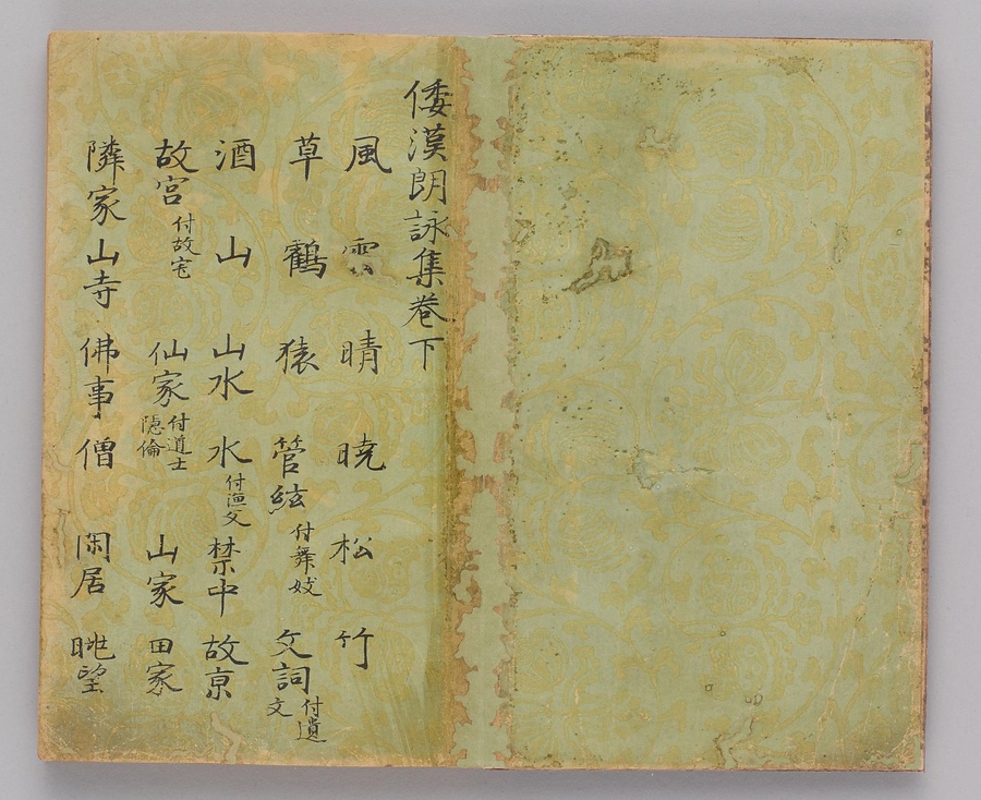 和漢朗詠集は、平安時代に貴族の間で朗詠に適した漢詩文の秀句と和歌を題ごとにまとめた詩歌集である。撰者とされる藤原公任(966~1041)は、当代きっての文化人であり、彼の撰による本詩歌集は、後世まで朗詠や詩歌詠作のためのテキストや書道手本として利用されただけでなく、平安時代の我が国の文化を知るための資料としても重視されている。