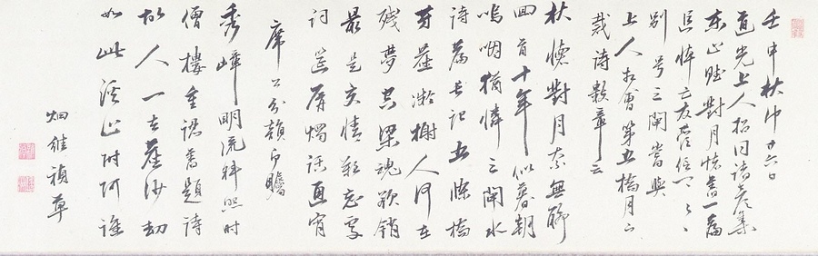 恥庵追悼詩画巻 5)七言律詩「壬申秋中廿六日道光上人招同諸彦集東山賦対月懐旧一篇追悼亡友菅信卿信卿別号三閘当與上人相会第五橋月下裁数章云」「席上分韻即矚」