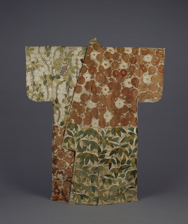春の梅、夏の藤、秋の楓、冬の雪持ち笹と、四季を象徴する草花を、四つに大きく分割した背面の区画それぞれに配した小袖。室町時代の文献では、「八つ替」「十六替」など、背面を分割した区画数で小袖の意匠を記述しており、それに従えばこれは四つ替の小袖となる。いずれの文様も、意匠化はされているものの、あふれるような生命感に満ちており、それらが室町から桃山時代の刺繍に特徴的な、形象を糸渡り長く繍いとる渡し繍の技法であらわされている。さらに、写実にとらわれず刺繍糸の色を唐突に替える色替わりが認められる点、刺繍の隙間に金箔と銀箔を不規則に摺り詰める点など、随所にこの時代の繍箔小袖の特徴が備えられている。