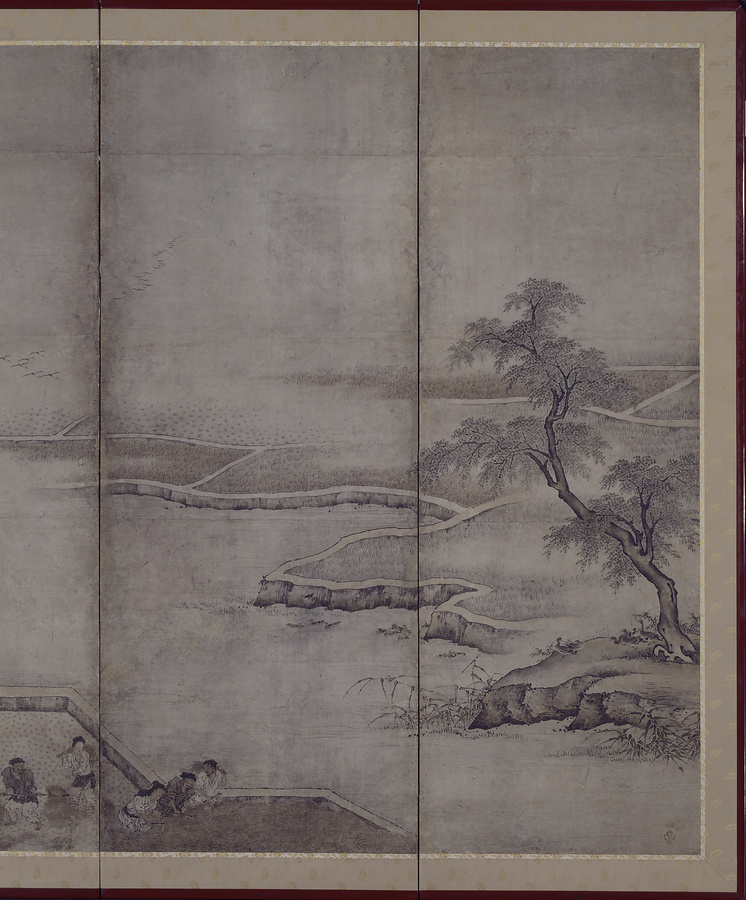 狩野派の二代目・元信(もとのぶ 1477~1559)の印を捺すもので、稲刈りから入倉(にっそう)までの米作りの様子があらわされている。もとは種籾浸(たねもみびた)しから田植えまでの情景を右隻に描く一双屏風の左隻分であったものであろう。諸景物は伝梁楷(りょうかい)筆「耕織図巻」からの借用だが、破綻のない構成と堅実な筆遣いに専門絵師集団・狩野派の技量の高さが見て取れよう。