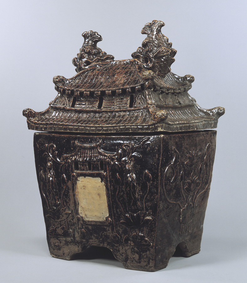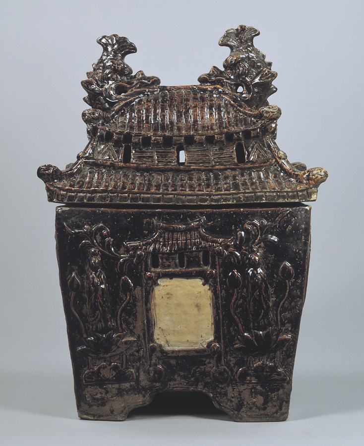 厨子甕(ジーシガーミ)は洗骨を入れて墓室に納めるという、琉球王朝時代以来続いた沖縄特有の埋葬方法を象徴する蔵骨器のこと。御殿形のほか筒形や壺形などが見られるが、二層の屋根を持つ御殿形のこの作品は稀少な例といえる。濃い紫色の釉が総体に掛かる。