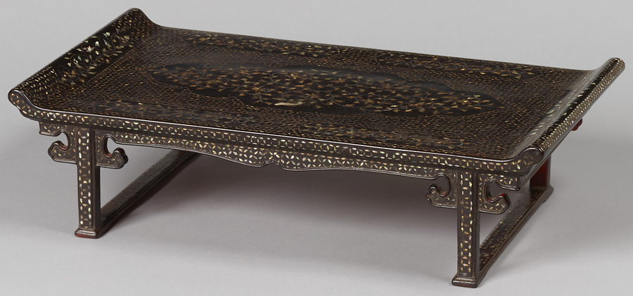 長方形の天板に低い脚を付けた小形の卓で、天板の左右両端にはゆるやかな筆返しを設ける。総体黒漆塗、天板中央にややいびつな四稜花形の窓枠を取り、枠内に牡丹唐草を螺鈿と金属線で表す。本品はその文様および技法の特徴から、高麗時代から朝鮮王朝時代にかかる時期に製作されたと考えられ、両時代にかかる過渡的作例として従来位置づけられてきた。現在、こうした作例は、わずかしか知られておらず、大変貴重な存在である。また、朝鮮王朝時代の螺鈿器は日本へ舶載されて大いに人気を博し、安土桃山時代には朝鮮風の螺鈿器も制作されるなど、日本の螺鈿にも大きな影響を与えた。