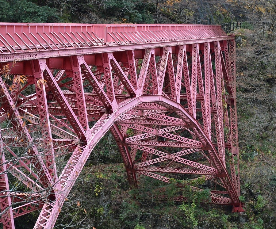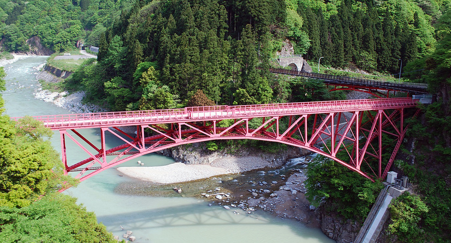 宇奈月温泉に位置し、黒部川に架かる旧鉄道橋。両端部の浮き上がり防止用にカウンター・バランスト構造を用いた、スパン六九メートルの鋼製スパンドレルブレーストアーチ橋。同形式の橋梁として我が国最古で、黒部川の電源開発を支えた貴重な大規模橋梁。