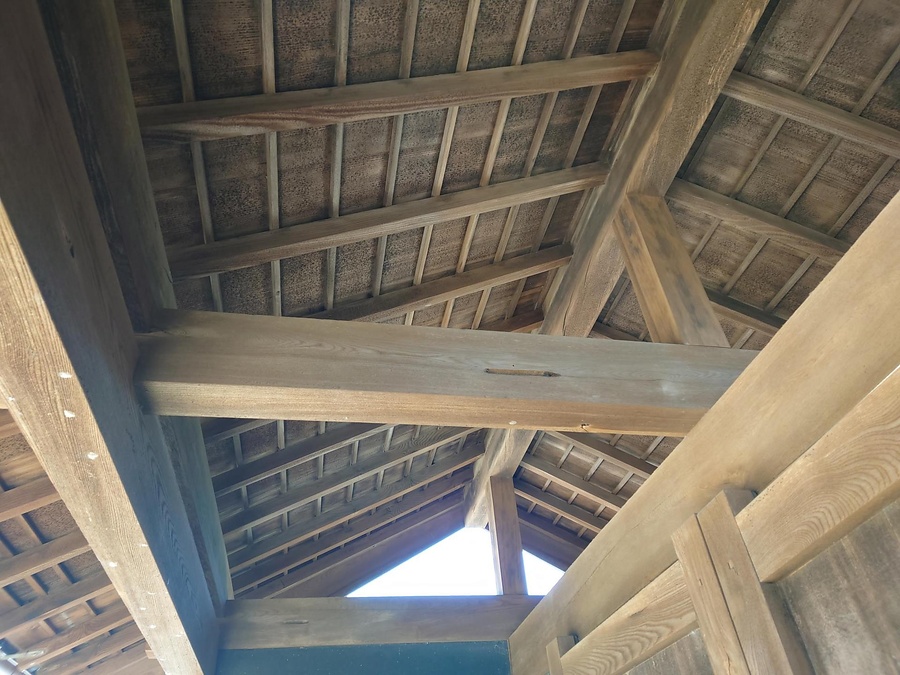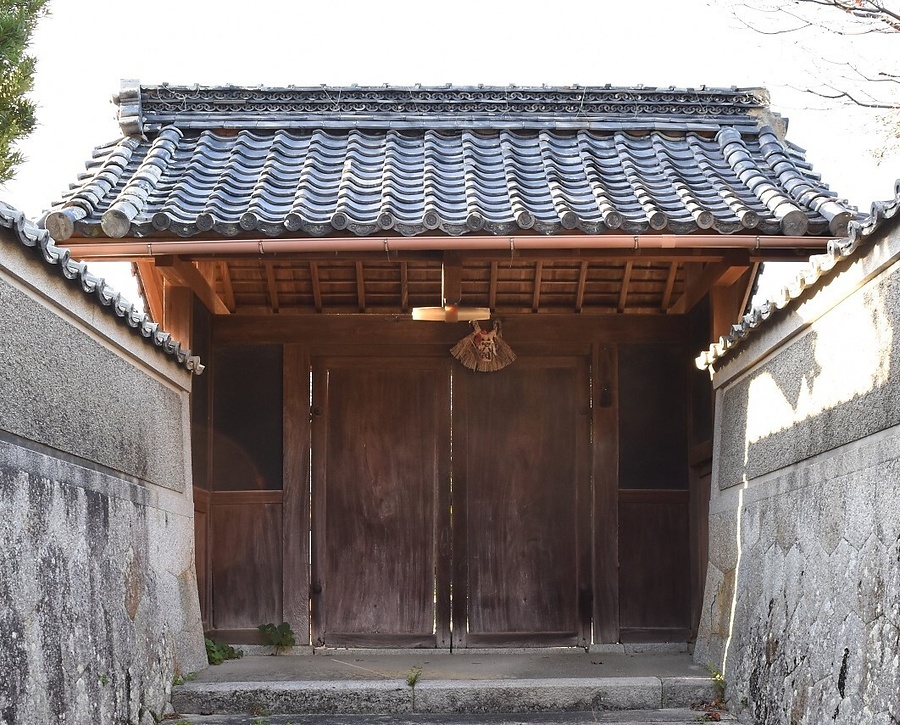 敷地東面の階段上部に建つ、切妻造平入桟瓦葺の門。冠木上に架けた三筋の梁上に立つ束で棟木を受け、軒は一軒疎棰。中央の門口にケヤキ一枚板の重厚な門扉を開く。脇間の壁は黒漆喰塗で、腰は竪板張とする。石塀と一体で旧家の格式ある表構えをつくる正門。