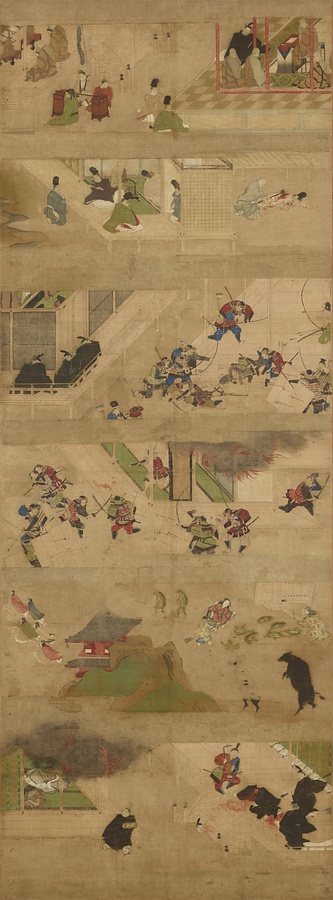 この作品は、聖徳太子の生涯を描いた3幅の掛け軸です。第一幅は太子が16歳から21歳までの間の11場面、第二幅は22歳から29歳までの間の13場面、第三幅は太子の死からその24年後の大化(たいか)の改新(かいしん)により蘇我入鹿(そがのいるか)が暗殺されるまでを描いています。場面の内容からすると、もとは8幅(ぷく)一組で太子の全生涯の物語をカバーしていたと考えられます。