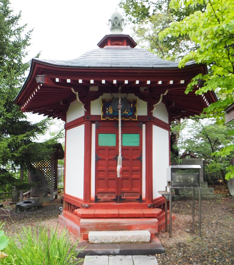 境内東側に西面して建つ六角堂。屋根銅板葺で頂部に露盤宝珠を飾る。土台上に六角柱を立て、地長押、内法長押を廻らし、絵様肘木で桁を受け、軒は一軒扇垂木。正面は桟唐戸を開いて縁を付し、木部は弁柄塗。大振りな持送で隅木を支え、軒廻り賑やかな小堂。