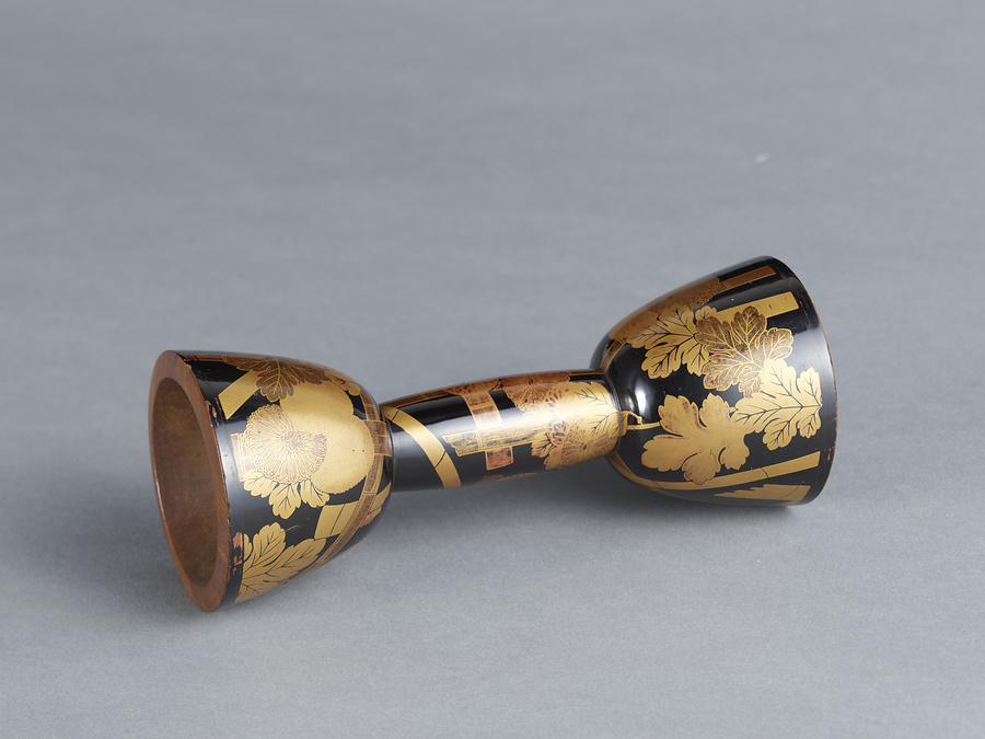 能や狂言に用いる打楽器の胴部分。この両端に皮を張った鉄輪(かなわ)を当てがい、麻紐で縛って使う。外側を黒漆で塗り、金粉を平らに蒔きつける平蒔絵(ひらまきえ)やパール塗装風に蒔きつける絵梨地(えなしじ)、その上にさらに蒔絵をする付描(つけがき)などの技法を用いて、竹を組んだ垣根と菊を描く。乳袋(ちぶくろ)内に墨書があるが読めない。能を嗜んだ寄贈者の愛用品だった。