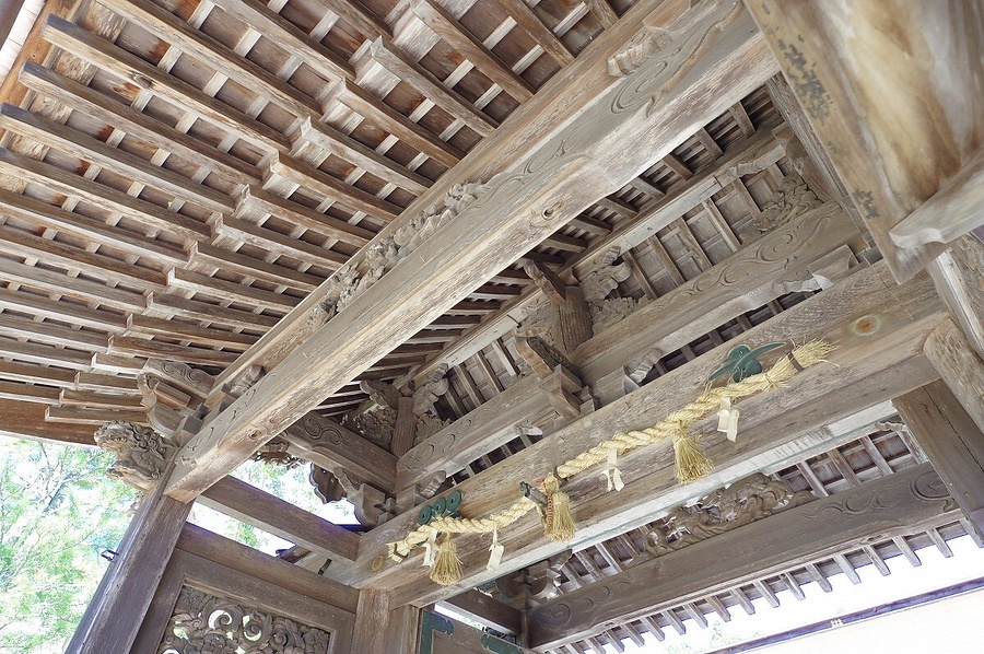 境内南東端に南面して建つ四脚門。切妻造檜皮葺で箱棟に鬼板を飾り、東側に潜戸付袖塀を付す。主柱は円柱、控柱は角柱で三斗を組み、軒は二軒疎垂木。獅子鼻や獏鼻、腰貫上部の牡丹唐草の透欄間など精緻な彫刻を付し、要所の錺金具とともに装飾豊富な山門。