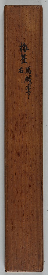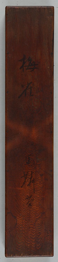画面右上には、15世紀前半、室町幕府の第6代将軍として在位した足利義教(あしかがよしのり)が所蔵したことを示す印がおされています。東京の五島美術館(ごとうびじゅつかん)には、この図とほぼ同じ大きさで、左上に同じ印をもつ作品が所蔵されており、こちらは梅に2羽のジョウビタキが表わされています。現在、東京国立博物館と五島美術館にわかれて所蔵されている2幅は、もともと1対で足利将軍家のコレクションにあった、由緒ある品であることがわかります。
