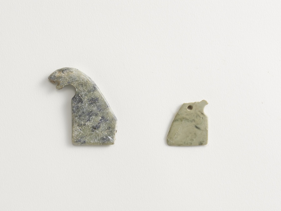 扁平な角丸三角形の耳飾で、三角形の頂点部分に穿孔を施し、穿孔から三角形底辺の中央にまで長い切り込みを加えた石製耳飾。現状では、穿孔部で割れ、半分を欠失している。割れ口に沿って補修孔が見られる。玦状耳飾はC字状を呈し、縄文時代早期から中期の日本列島全域で出土する。中国の同形の耳飾が「玦」と呼ばれることからこの名がある。同形の耳飾は、東アジア一帯で出土し、中国から各地へ伝わったと考えられている。日本のものは縄文時代早期に環状のC字形のものがあり、前期には扁平化し平面形が縦円状や三角形状となり、孔が小型化、切り込みが長くなる。中期に入り横長化や縦長化が進行する。