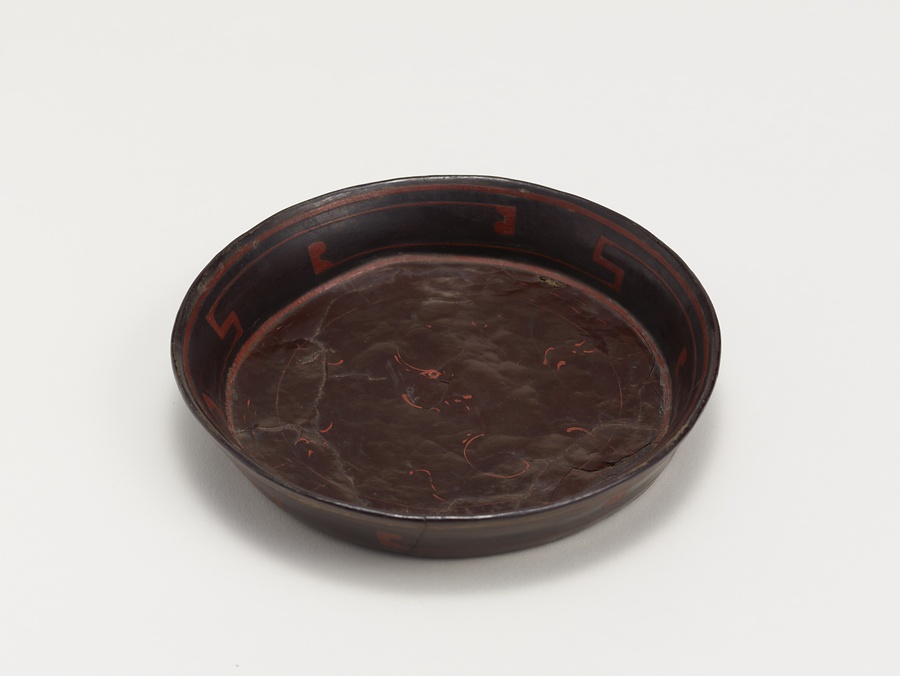 盤のように浅い平底の漆器であるが、小ぶりで、口縁部が外に張り出さない形状はたいへん珍しい。高台はない。内外面に黒漆を塗り、器壁の内外面と見込みに朱漆で文様を描く。内面は器壁に屈曲しながら展開する変形雲気文をめぐらし、見込みには曲線で雲気文を配し、中央に鳳凰文を描く。