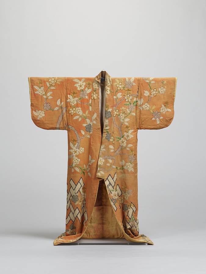 農民歌舞伎の衣裳という伝承のもと山形の鶴岡に伝わった小袖。縮緬地に桧垣と桜の立木文様を型染めで表現している。このような立木文様の小袖は江戸期を通して製作されたが、器物文様と組み合わされること、腰の上下で文様が連続しないこと、摺匹田(型鹿子)を用いていること、地組織が縮緬であること、左脇にわずかな空間を残した文様配置であることから、元禄期(1688-1704)から正徳期(1711-1716)にかけて製作された小袖(もとは振袖)と考えられる。当初の地色は淡い黄と思われるが、現在は顔料(鉛丹)にて橙に塗られる。また中綿は除去され、背部分に木綿の裏地が当てられている。舞台衣装への転用を目的として改変されたと思われる。
