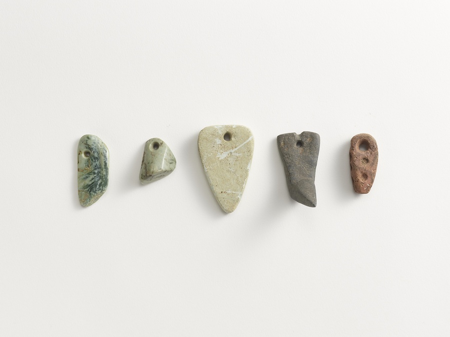 東北北部の石製装身具である。(3)はサメの歯製垂飾を模したもの、(4)は勾玉形の自然石に穿孔を加えたもの、(5)は列点文を加え装飾性を高めたものである。