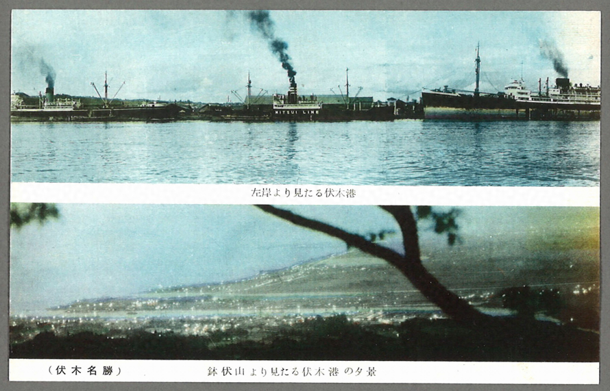 上部の写真には伏木港に集まる3艘の船が写っており、中央の船には「MITSUI LINE」と記されている。