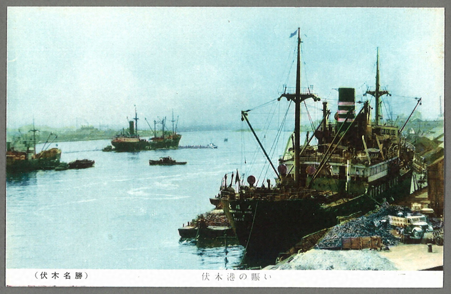 伏木港に集まる3艘の船が写っており、右側の船には「七福丸/SHICHIFUKU MARU/東京/TOKYO」「MITSUI LINE」と記されており、ロゴから三井船舶株式会社(現・株式会社商船三井)の七福丸と考えられる。