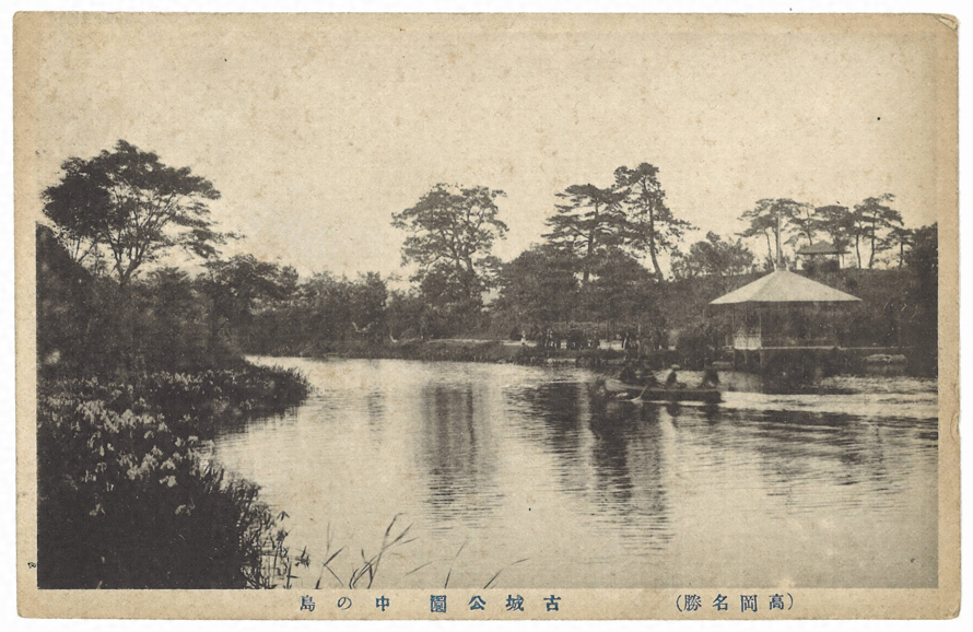 中の島は明治42年(1909)の皇太子北陸行啓に備えての公園整備の一環として、同40年に畑であった民有地1,365坪を市が買収し、その北西側を掘って水堀と繋げて造成した人工の島である。中の島には多くの人がいる。ボート遊びをしている奥には、現在の東屋(緑翠亭)の前身のものがある。またさらにその奥の小竹藪にも東屋があるが、この位置に現在、東屋は無い。本丸側の水際には菖蒲などが繁茂している。