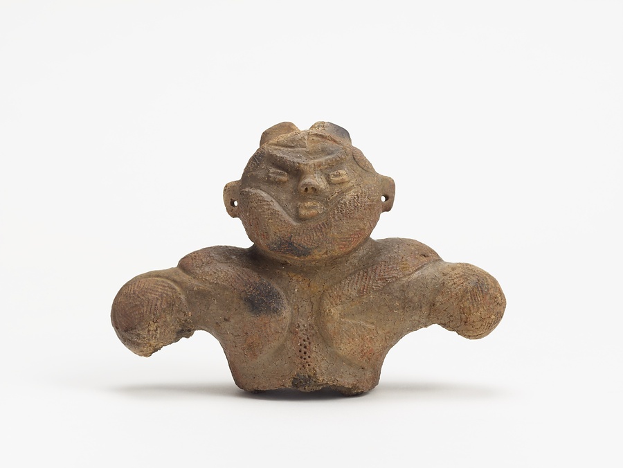 縄文時代後期の東北地方を中心に分布する土偶。乳房の貼瘤や襷状の磨消縄文(無文部と縄文部を沈線によって区画する文様)は同時期の土器に見られる文様で、その表現を上手く取り入れて製作されている。この時期の土偶は、本品や北海道著保内野遺跡出土の中空土偶(国宝、函館市教育委員会所蔵)のように土器製作技術を用いて中空に作られ、大型化するものがある。なお、本品の後頭部には焼成時の破損防止のため、横長の長方形の孔が穿たれている。X線CTで観察したところ、この孔の少し下部に粘土で塞がれた円形の孔がみられ、破損防止用の孔が焼成前に作り変えられていることが判明した。