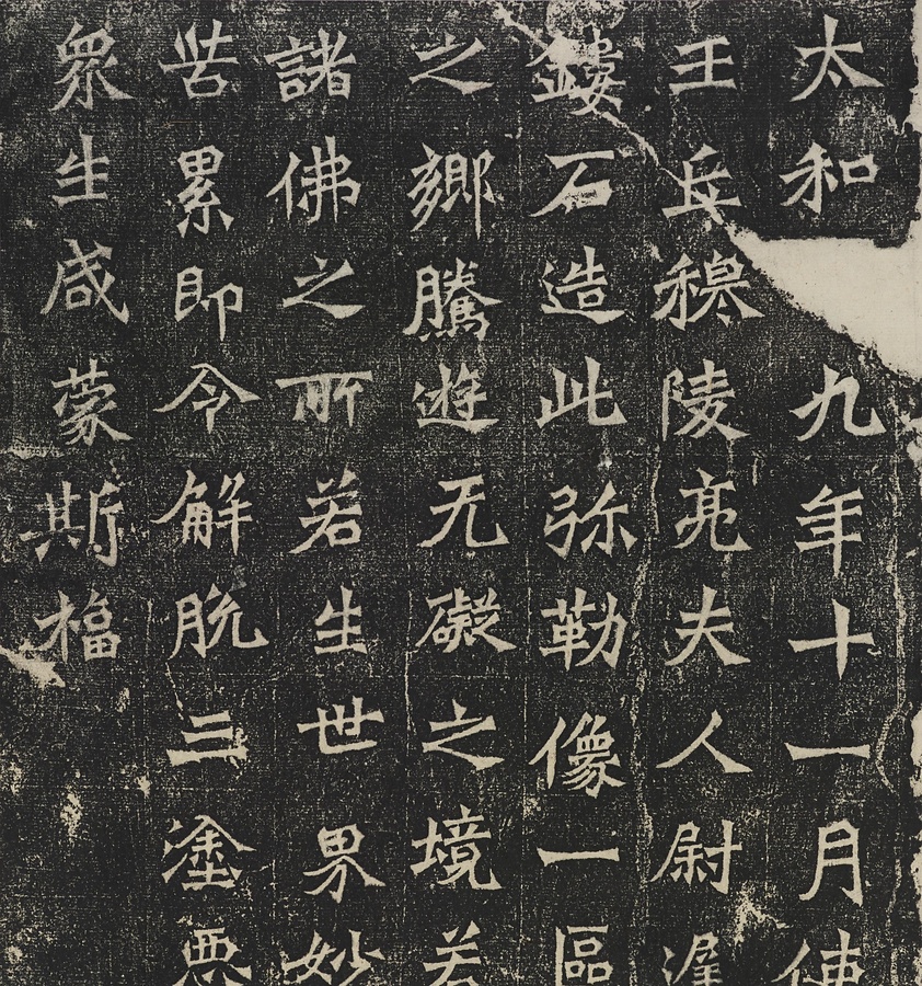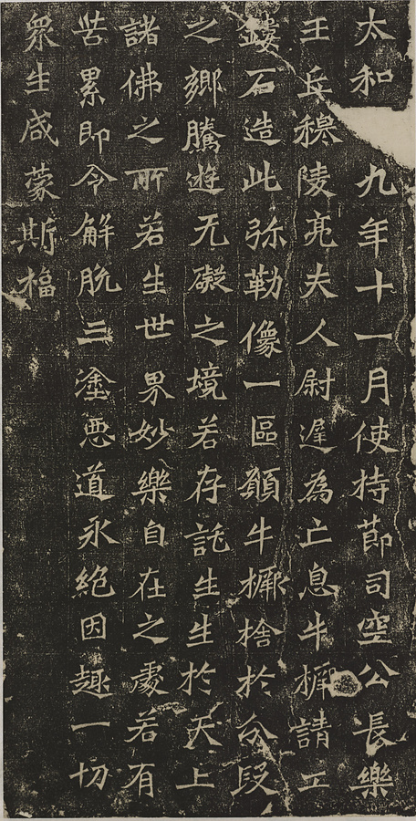 子息の牛橛@ぎゅうけつ@を亡くした母の尉遅@いち@が、495年の11月に追善供養として弥勒像1体を造った際の経緯が記されています。紀年のある龍門造像記の中では最も古い作例で、重厚で格調高い書きぶりから、龍門10品の一つにあげられています。(富田さん執筆)(20150414_t082)