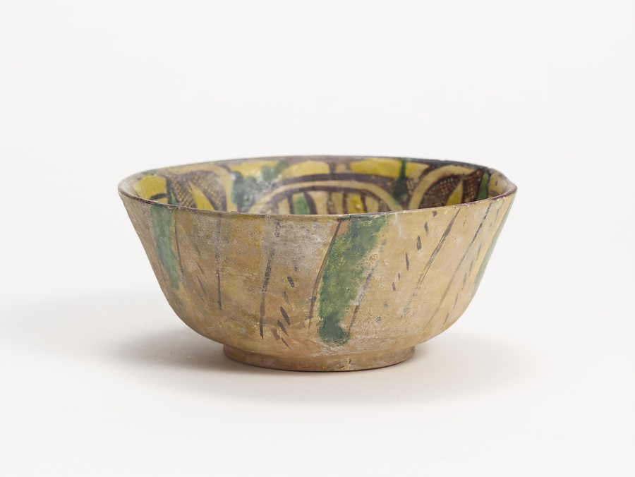 薄い茶褐色の胎土を用いた、底面から緩やかな曲線を描きながら少し外反する鉢。底面にいたるまで全面に白化粧土を掛け、内面を中心に白釉を施し、緑色、黄色、黒褐色の絵具で花文を内面全体に描いている。外面には黒褐色の線と列点文および緑色の絵具による太い線が描かれている。底面はほぼ平らなままだが、内部に見られる刻線による円文の内側は少し削られている。この作品のように、緑、黄、紫系の絵具を用いて、刻線で文様を表した作品を一般にペルシア三彩と呼ぶ。